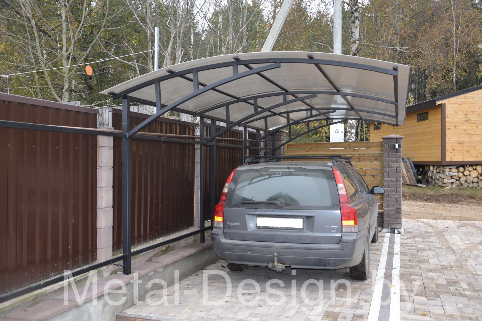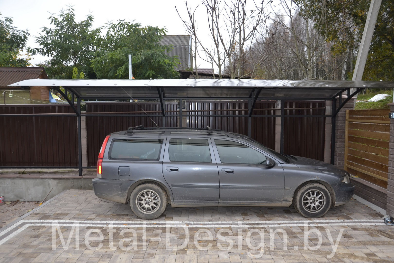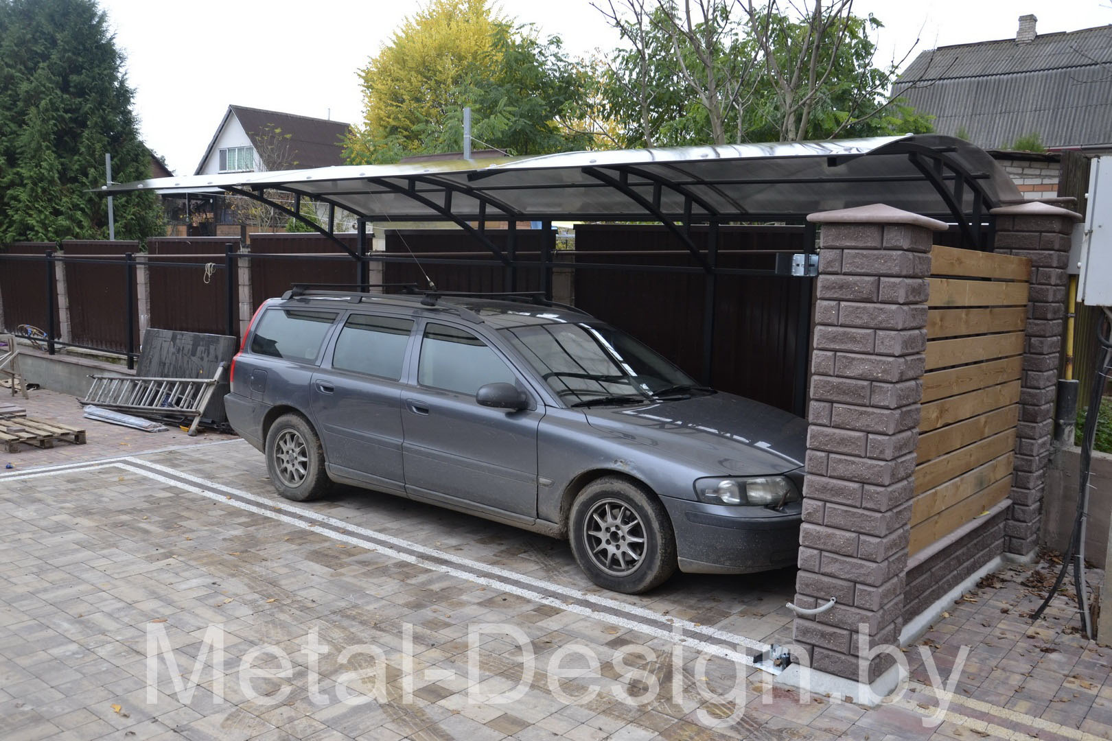 Комплектация: Навес опирается на сварные гнутые фермы сечением 40*40*2мм. Столбами служит действующий усиленый каркас будущего забора. Грунт и Эмаль производство Германия. Поликарбонат Россия.